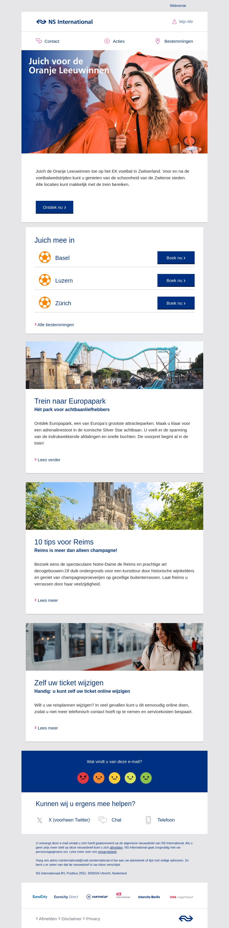 Juich voor de Oranje Leeuwinnen tijdens het EK voetbal in Zwitserland. Ontdek de prachtige steden Basel, Luzern en Zürich met gemakkelijke treinreizen. Geniet van ontspannende uitstapjes en boek nu je tickets. Laat je verrassen door de adembenemende Zwitserse landschappen en culturen.