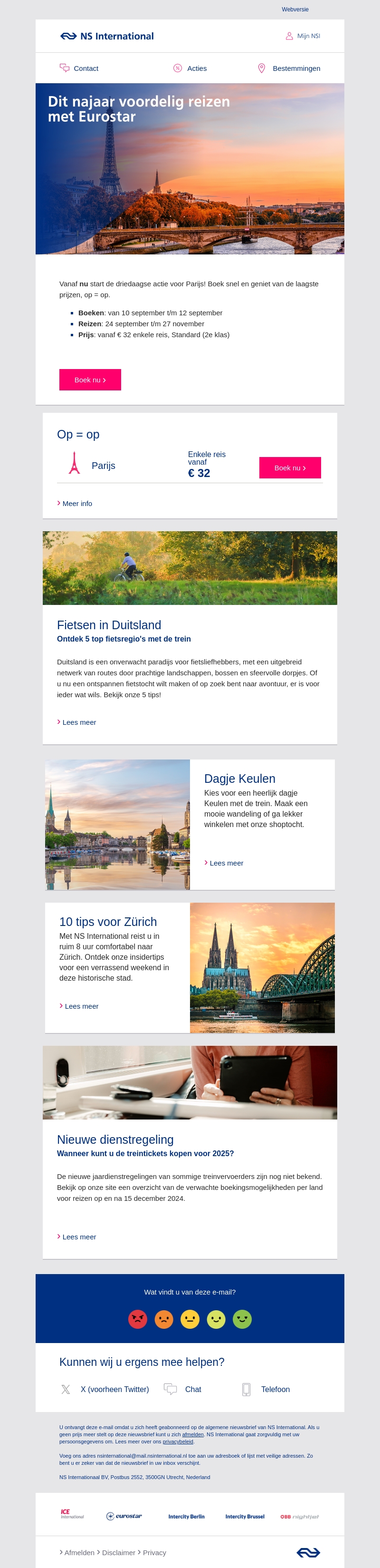 Vanaf nu start de driedaagse actie voor Parijs! Boek snel en geniet van de laagste prijzen, op = op. Reisperiode: 24 september t/m 27 november. Prijs: €32 enkele reis, standaard klasse (2e klas). Mis deze geweldige kans niet!