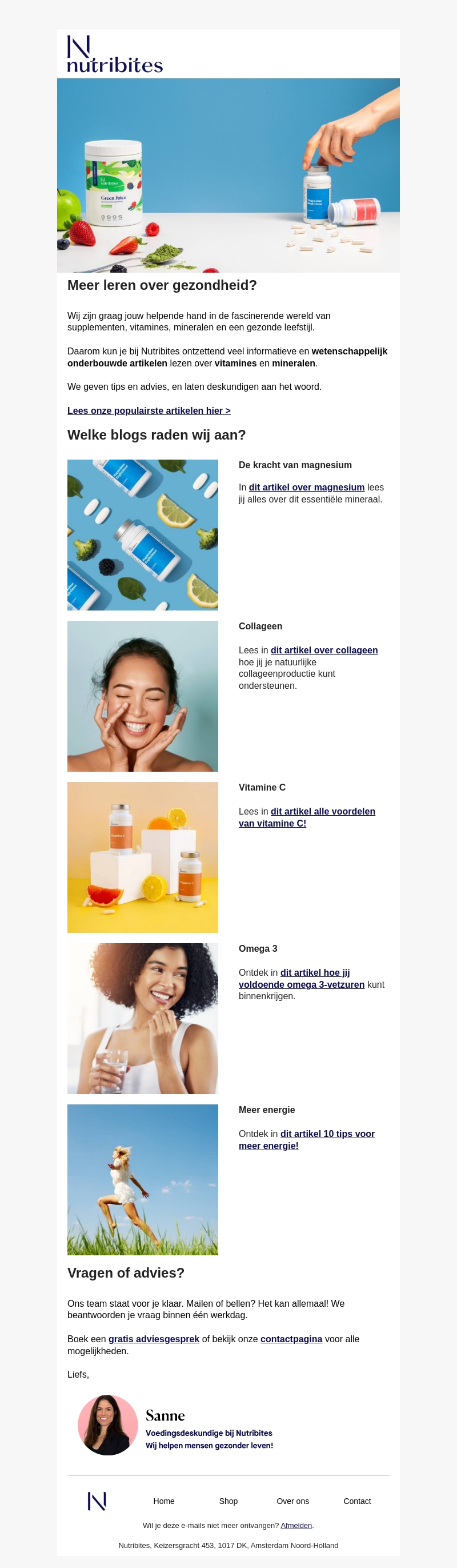 Wil je meer leren over gezondheid? Nutribites biedt uitgebreide informatie over supplementen, vitamines, mineralen en een gezonde levensstijl. Lees populaire artikelen en ontdek de kracht van magnesium, collageen, vitamine C, en omega 3. Krijg tips voor meer energie en boek een gratis adviesgesprek.