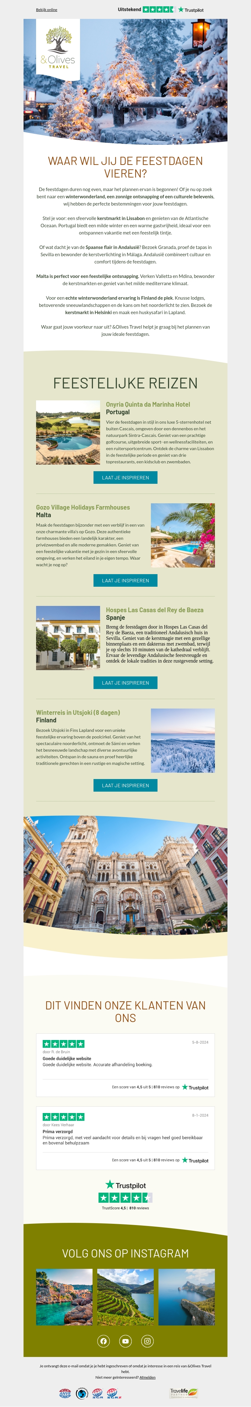 De feestdagen staan voor de deur en & Olives Travel biedt je de beste bestemmingen aan. Van kerstmarkten in Lissabon tot winterreis in het charmante Finland, we hebben voor elk wat wils. Ontdek onze topkeuzes en laat je inspireren om je feestdagen onvergetelijk te maken.
