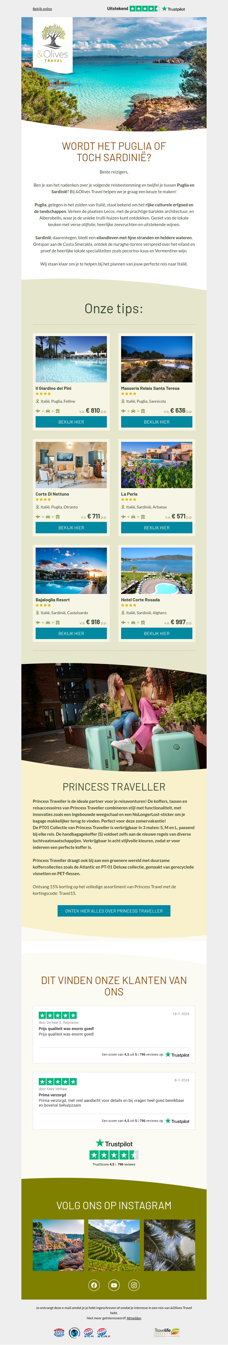 Ben je aan het twijfelen tussen Puglia en Sardinië? Ontdek beide adembenemende Italiaanse bestemmingen met &Olives Travel. Geniet van onze exclusieve reispakketten en maak je keuze eenvoudiger.