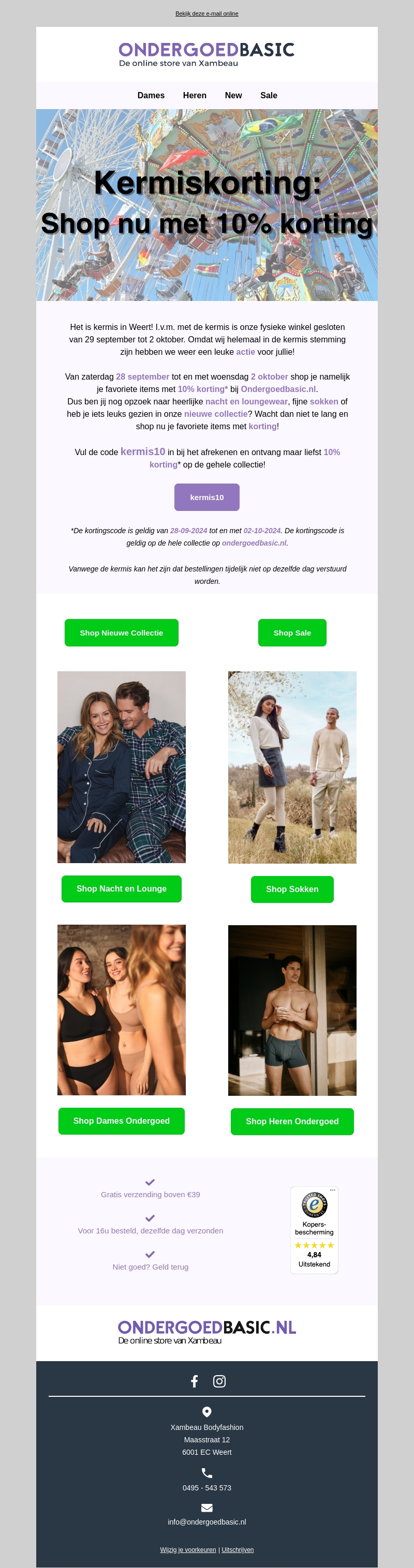 Het is kermis in Weert en bij OndergoedBasic vieren we mee met 10% korting op onze gehele collectie. Gebruik de code kermis10 bij het afrekenen en shop je favoriete nachtkleding, lingerie en sokken tegen gereduceerde prijzen. Wees er snel bij, de actie loopt van 28 september tot en met 2 oktober.