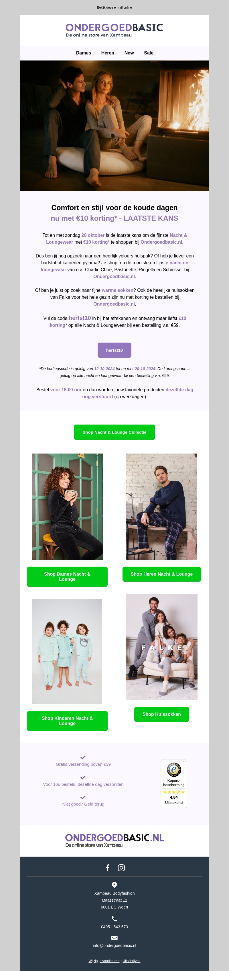 Ervaar gezelligheid met onze exclusieve korting op nacht- en loungewear. Shop van 12 tot 20 oktober met €10 korting op bestellingen boven de €59 bij OndergoedBasic. Ontdek comfortabele items van topmerken zoals Charlie Choe en Schiesser. Vergeet de code herfst10 niet in te voeren voor deze speciale aanbieding. Bestel voor 16.00 uur voor levering op dezelfde dag.