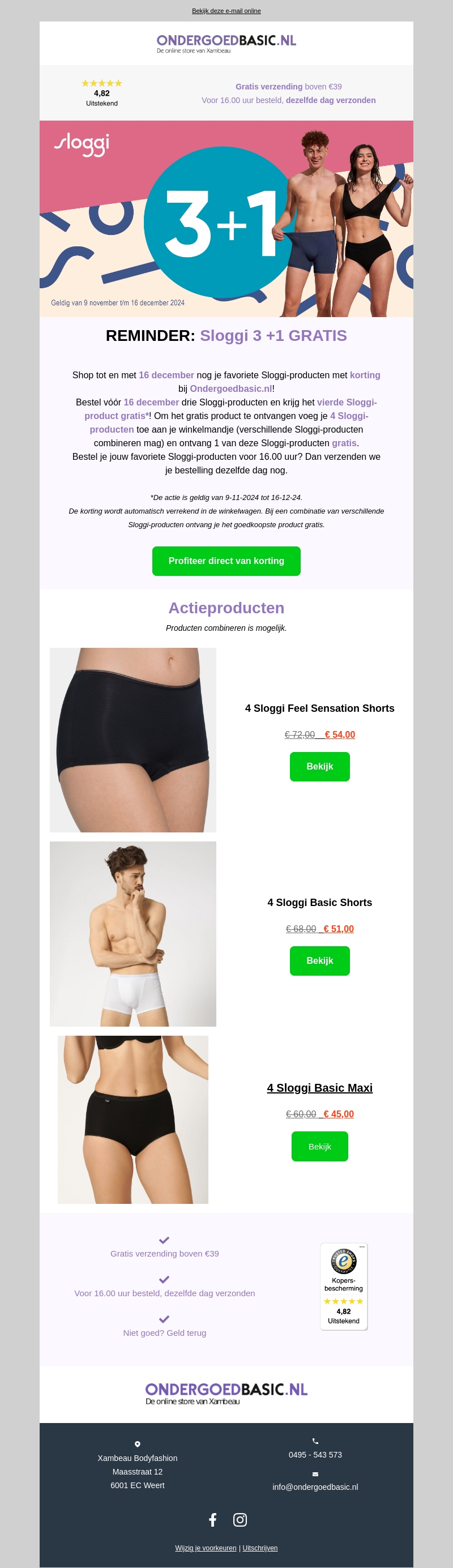 Koop drie Sloggi-producten en ontvang het vierde gratis tot 16 december 2024. Voeg vier productvarianten toe aan je winkelwagen en profiteer van een geweldige korting. Bestel vóór 16.00 uur en krijg je bestelling dezelfde dag verzonden. Gratis verzending bij bestellingen boven €39.