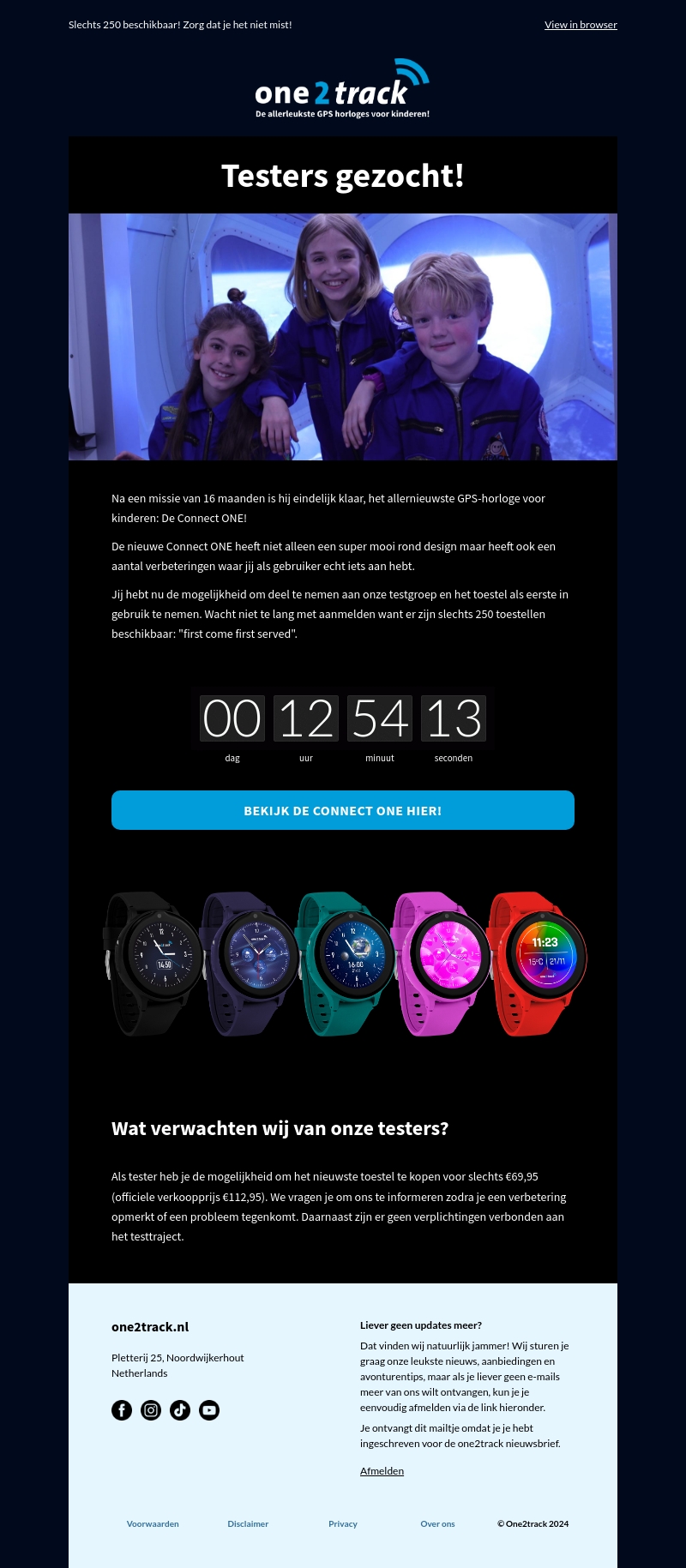 Na 16 maanden is het eindelijk zover: introductie van de Connect ONE, het nieuwste GPS-horloge voor kinderen. Met een stijlvol, rond design en verbeterde functies biedt dit horloge het beste voor gebruikers. Meld je aan voor onze testgroep en ervaar als eerste het apparaat. Zorg dat je snel bent, want er zijn maar 250 stuks beschikbaar. 'First come, first served'!