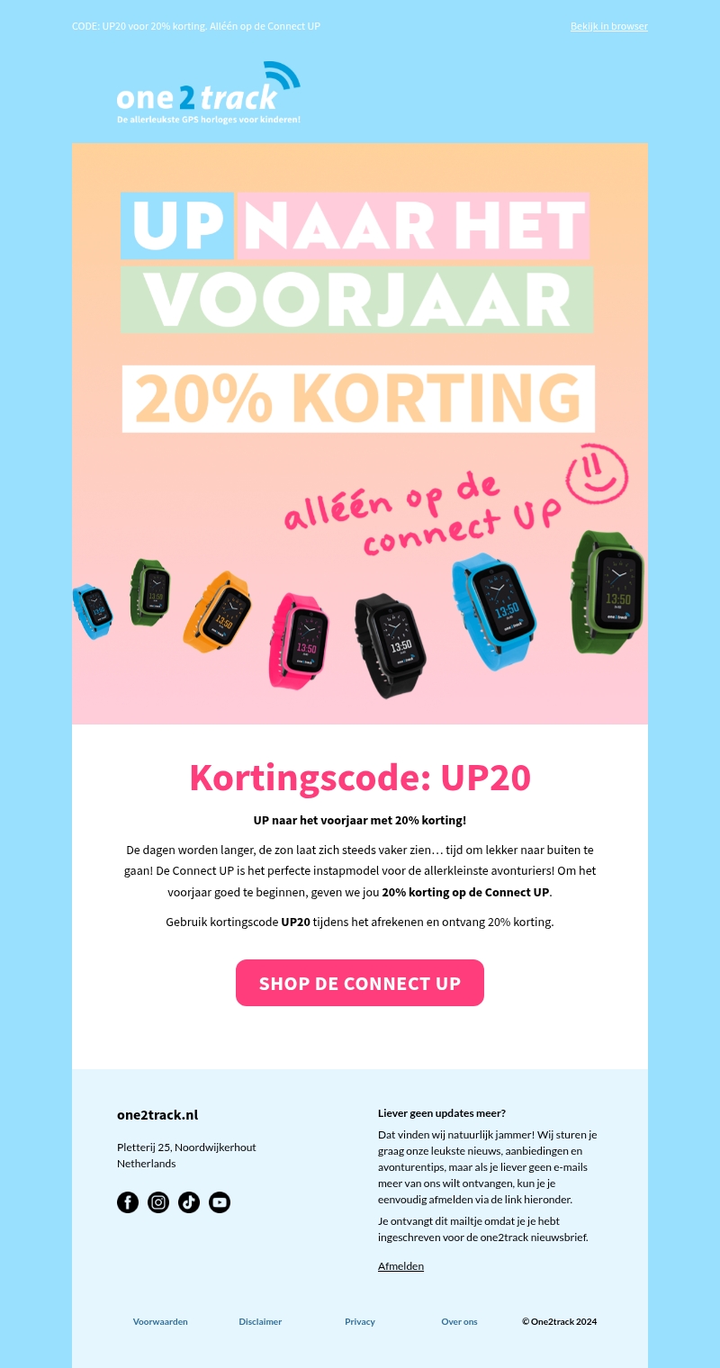 Geniet van de lente met 20% korting op het Connect UP GPS-horloge van one2track. De dagen worden langer en het weer nodigt uit voor buitenavonturen. Met deze speciale aanbieding is het de perfecte tijd om uw kleintjes te voorzien van het Connect UP GPS-horloge. Mis deze kans niet en gebruik de kortingscode UP20 voor uw aankoop.