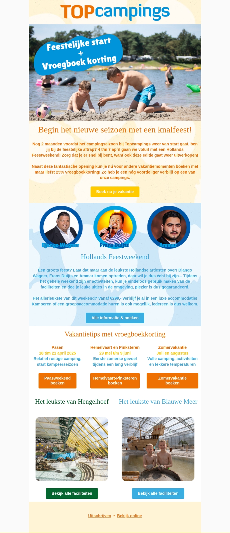 Bereid je voor op een spectaculair kampeerseizoen met Topcampings! Van 4 tot 7 april verwelkomen wij je voor een onvergetelijk Hollands Feestweekend. Boek nu je vakantie met 25% vroegboekkorting en geniet van bijzondere optredens en activiteiten. Neem deel aan de festiviteiten en ontdek de beste campinglocaties.
