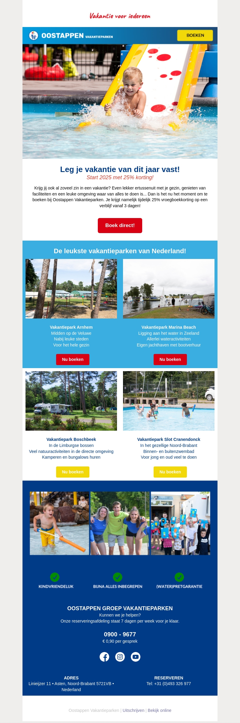 Mis deze kans niet om je vakantie vroeg te boeken bij Oostappen Vakantieparken met een exclusieve 25% korting. Geniet van geweldige faciliteiten en een heerlijke omgeving nabij steden en natuurgebieden. Boek nu een verblijf van minimaal 3 dagen en profiteer van deze speciale aanbieding.