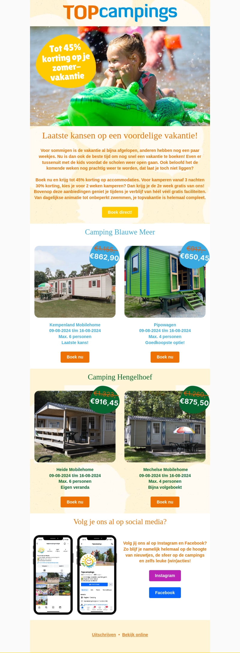 De laatste zomervakantieweken zijn begonnen en dit is jouw kans om te profiteren van geweldige kortingen bij TOPcampings. Met tot 45% korting op accommodaties en speciale aanbiedingen voor kamperen, is het de ideale tijd om je zomervakantie te boeken. Geniet van een onvergetelijke vakantie met volop faciliteiten en animatie voor het hele gezin. Bekijk nu de beschikbare campings en boek direct.