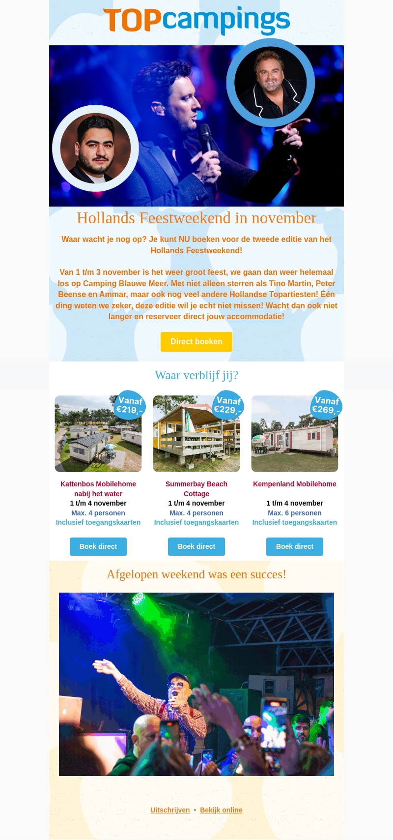Het Hollands Feestweekend keert terug in november! Boek nu voor de tweede editie en geniet van optredens van Tino Martin, Peter Beense en Ammar op Camping Blauwe Meer. Reserveer direct jouw accommodatie en zorg dat je er bij bent!