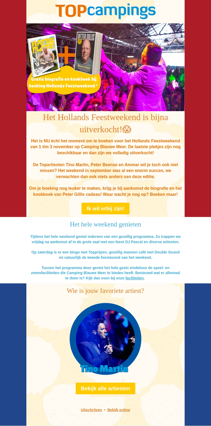 Het Hollands Feestweekend op Camping Blauwe Meer is bijna uitverkocht! Geniet van optredens van topartiesten zoals Tino Martin en Peter Beense. Boek vandaag nog om een gratis biografie en kookboek van Peter Gillis te ontvangen. Het weekend is gevuld met familieactiviteiten en live optredens. Zorg dat je erbij bent voor een onvergetelijke ervaring!