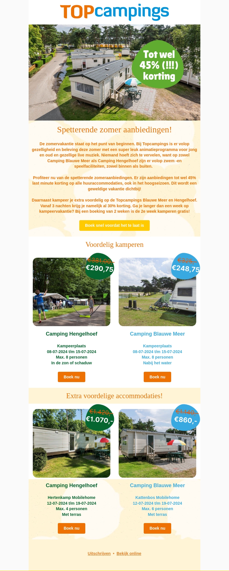 De zomervakantie staat voor de deur en Topcampings biedt geweldige kortingen tot wel 45% op alle huuraccommodaties. Geniet van een uitgebreid animatieprogramma en geweldige faciliteiten bij Camping Blauwe Meer en Camping Hengelhoef. Boek snel om de beste aanbiedingen te bemachtigen.