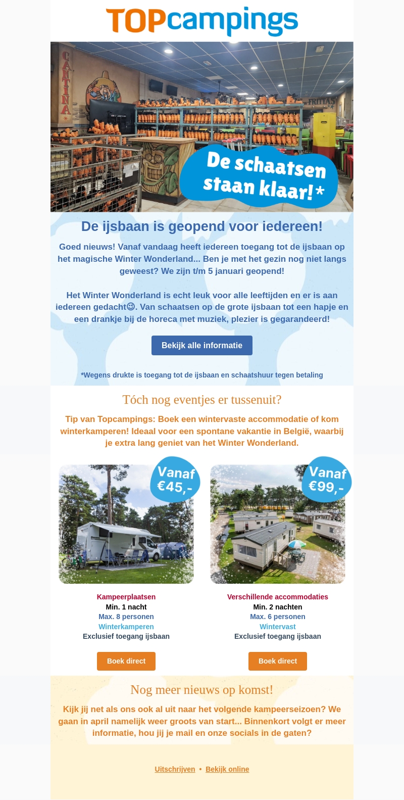 Goed nieuws voor winterliefhebbers! De ijsbaan van Winter Wonderland is nu voor iedereen toegankelijk. Plan een unieke winterervaring, met schaatsen, heerlijke hapjes en live muziek. Boek vandaag nog je speciale winterkampeeraccommodatie en geniet extra lang. Toegang tot de ijsbaan tot 5 januari. Ontdek meer over onze komende kampeerseizoenen.