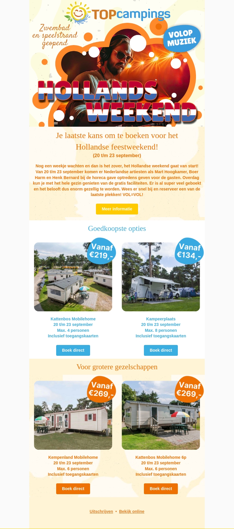 Dit is je laatste kans om te boeken voor het Hollandse feestweekend van 20 t/m 23 september! Geniet van optredens van Nederlandse artiesten, diverse faciliteiten, en een gezellige sfeer. Boek nu je verblijf voor een onvergetelijk weekend!