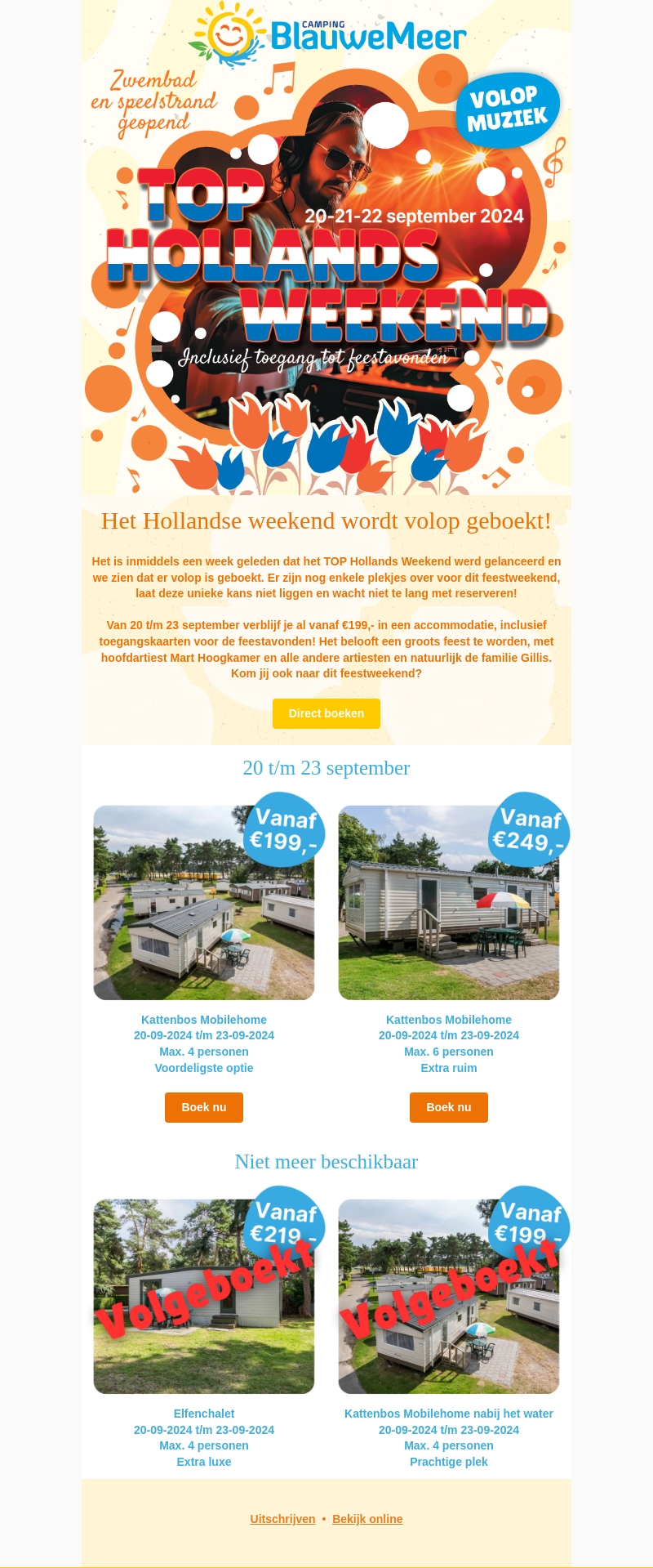 Het TOP Hollands Weekend bij Camping Blauwe Meer vindt plaats van 20 t/m 23 september 2024. Dit evenement is inclusief toegang tot feestavonden en muziekoptredens van onder andere Mart Hoogkamer. Verblijf in een Kattenbos Mobilehome vanaf β¬199,- en beleef een geweldig weekend vol plezier!
