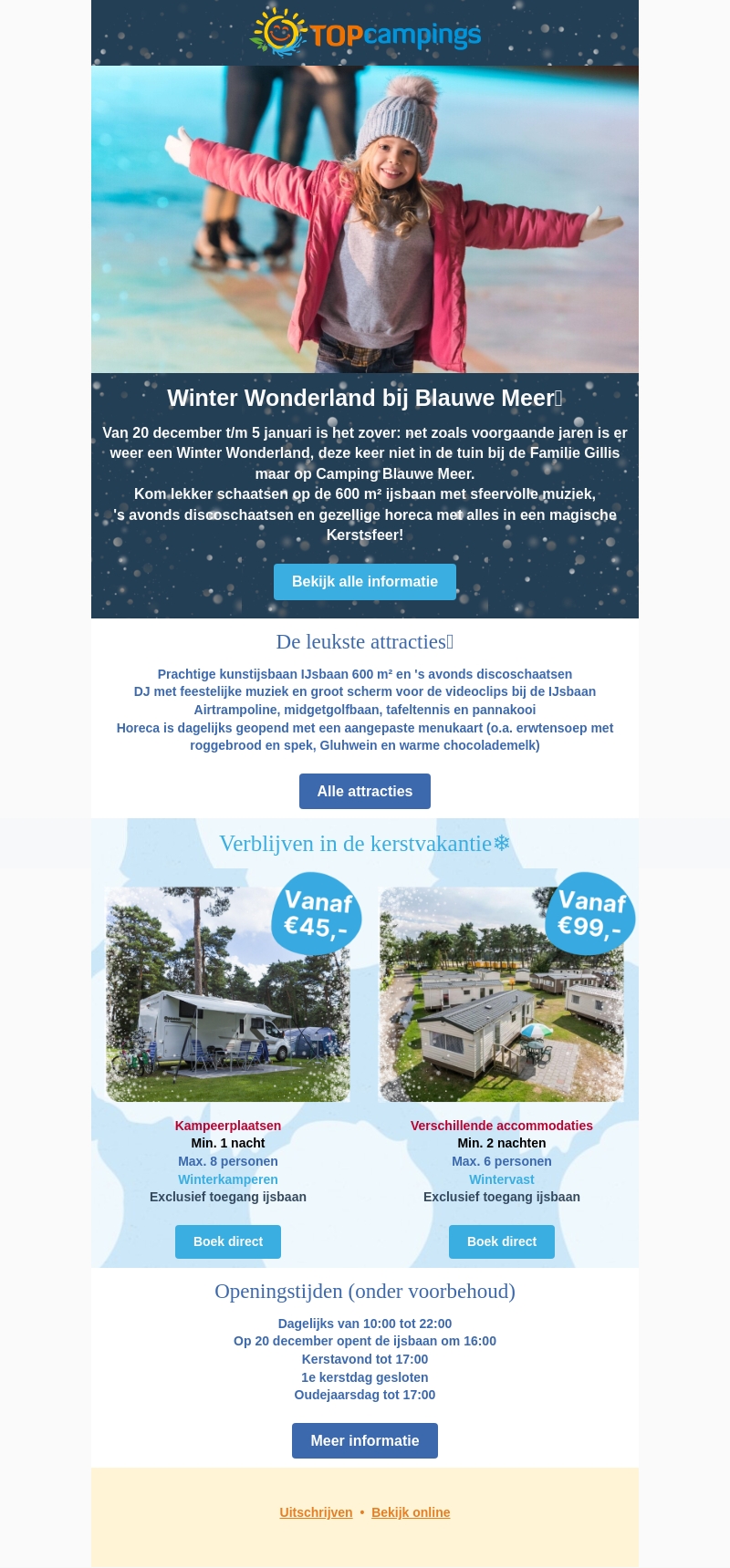 Kom naar het Winter Wonderland op Camping Blauwe Meer van 20 december tot 5 januari. Geniet van een 600 m² ijsbaan, sfeervolle muziek en gezellige horeca in kerstsfeer. Boek nu je verblijf, inclusief winterkamperen of wintervaste accommodaties vanaf €45,-. De leukste attracties wachten op jou!