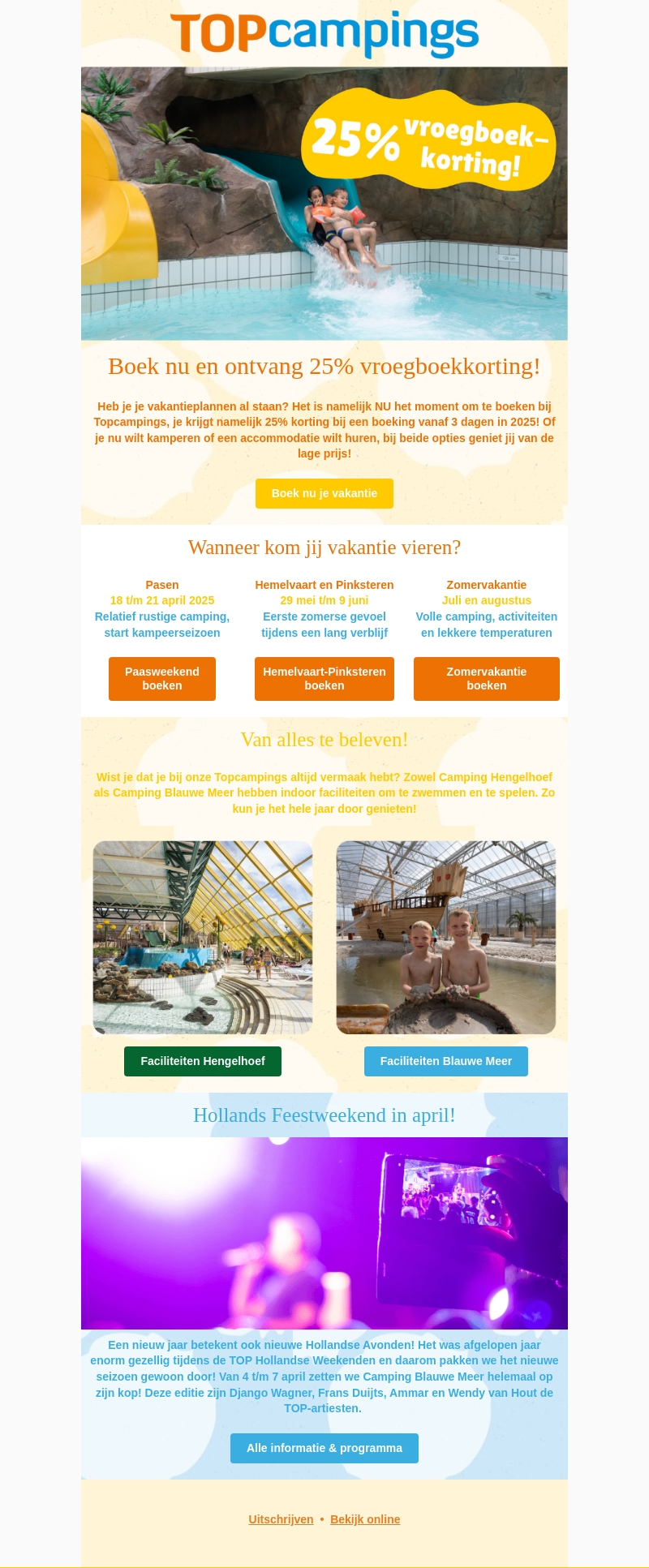 Boek nu je vakantie bij TOPcampings en profiteer van een aantrekkelijke 25% vroegboekkorting voor 2025. Geniet van een ontspannende tijd met verschillende faciliteiten bij Camping Hengelhoef en Camping Blauwe Meer. Verken de seizoensgebonden vakanties of beleef het Hollands Feestweekend in april. Mis deze kans niet voor een geweldige kampeervakantie!