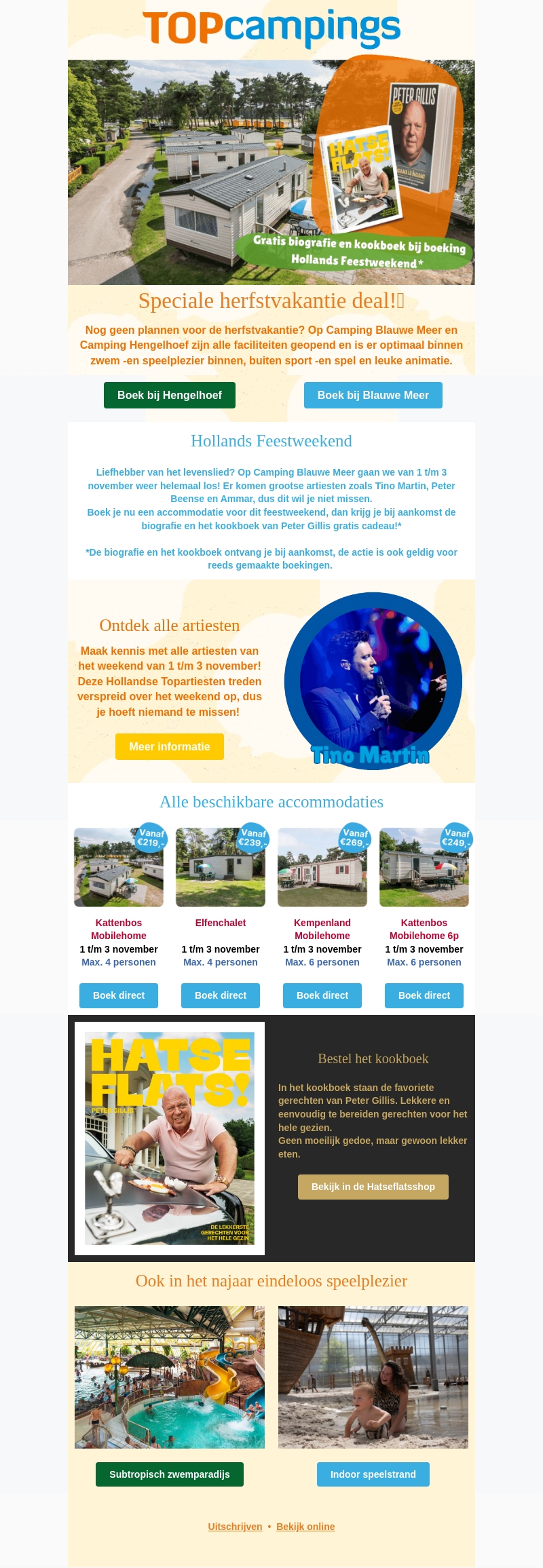 Nog geen plannen voor de herfstvakantie? Ontdek de speciale herfstvakantie deal bij Topcampings met unieke aanbiedingen zoals het Hollandse Feestweekend. Geniet van geweldige optredens en ontvang een gratis biografie en kookboek van Peter Gillis bij boeking. Ervaar eindeloos speelplezier in onze faciliteiten.