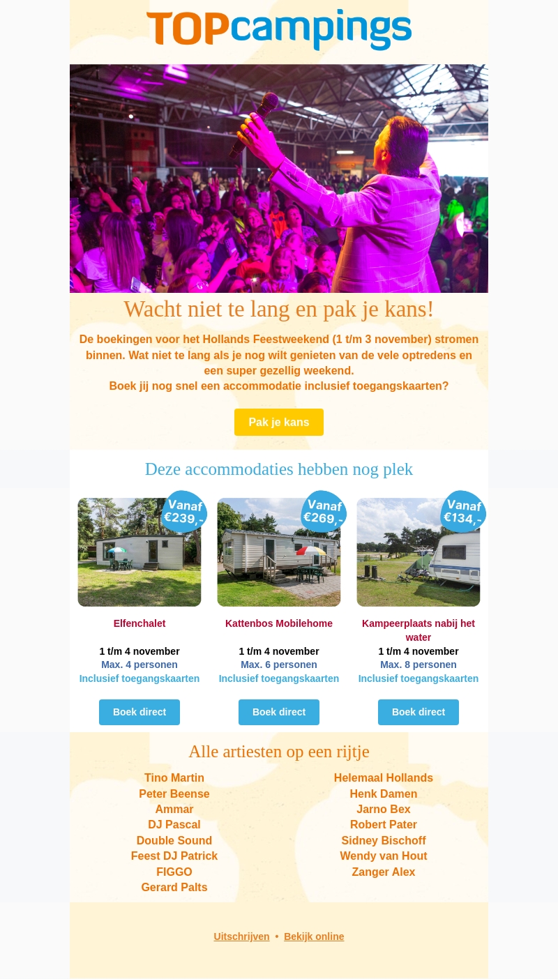 Beleef een onvergetelijk Hollands Feestweekend van 1 t/m 3 november. Geniet van diverse optredens en een gezellige sfeer. Boek snel je accommodatie inclusief toegangstickets. Er zijn nog plekken beschikbaar, dus mis deze kans niet om een geweldig weekend te beleven.