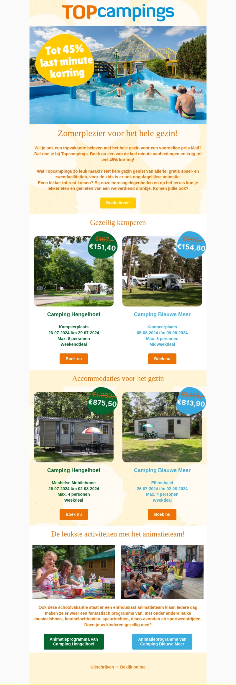 Beleef een topvakantie met het hele gezin bij Topcampings! Profiteer van last minute kortingen tot 45% en geniet van gratis speer- en zwemfaciliteiten, dagelijkse animatie voor de kids, en heerlijke horecagelegenheden. Kom tot rust en ervaar een onvergetelijke vakantie.