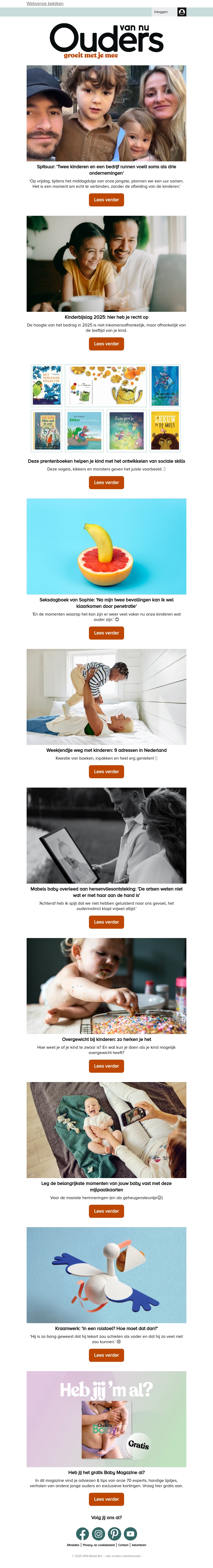 Deze nieuwsbrief van Ouders van Nu staat vol inspirerende verhalen en handige tips voor ouders. Of het nu gaat om de opvoeding, gezondheid, of het combineren van werk en gezin, er is voor iedereen wat wils. Ontdek de nieuwste kinderboeken, leer omgaan met bedtijdstruggles, en ontvang waardevol advies van experts. Ervaar hoe anderen met dezelfde uitdagingen omgaan en vind steun in herkenbare verhalen.