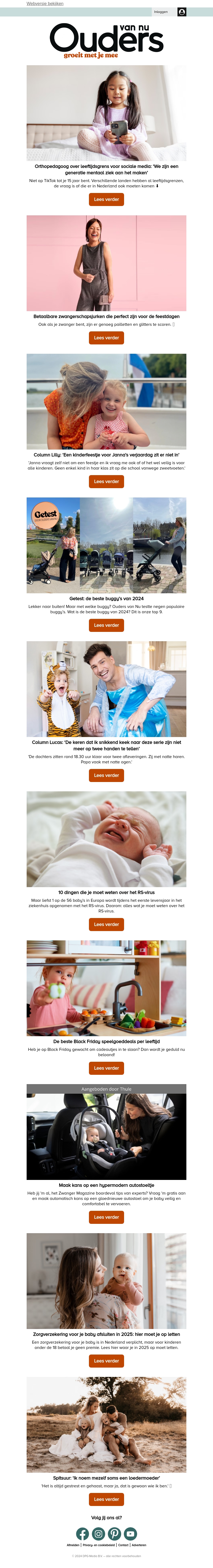 Ontvang tips en adviezen voor het ouderschap met de nieuwsbrief van Ouders van Nu. Van zwangerschapsverhalen tot opvoedadvies, alles komt aan bod. Interessante columns en de nieuwste producten voor kinderen worden besproken.
