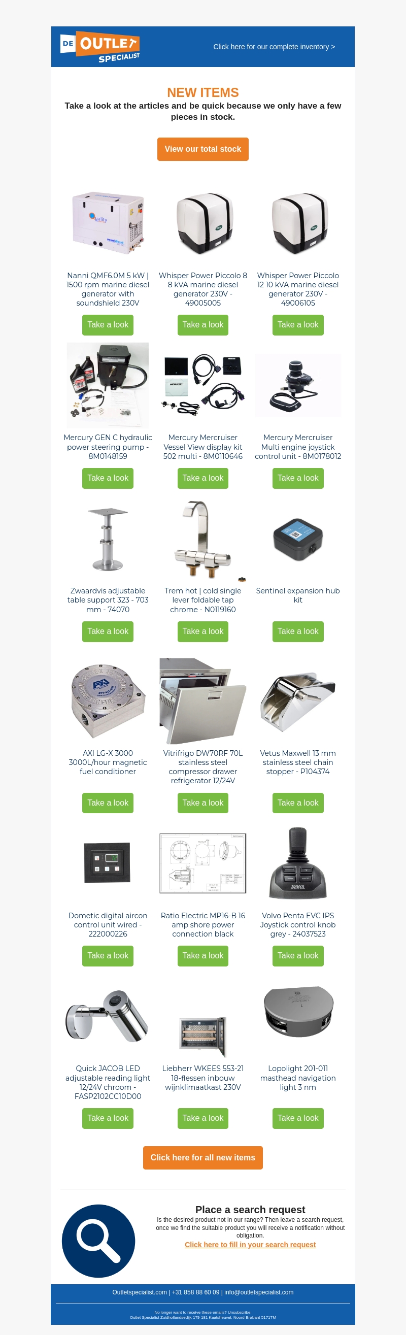 Bekijk de nieuwste producten van topmerken zoals Nanni, Mercury, Zwaardvis, Sentinel en meer. Van dieselgeneratoren en roerpropellers tot kettingstoppers en koelcompressoren, wij hebben alles wat je zoekt. Mis deze kans niet en bekijk ons volledige assortiment nu!