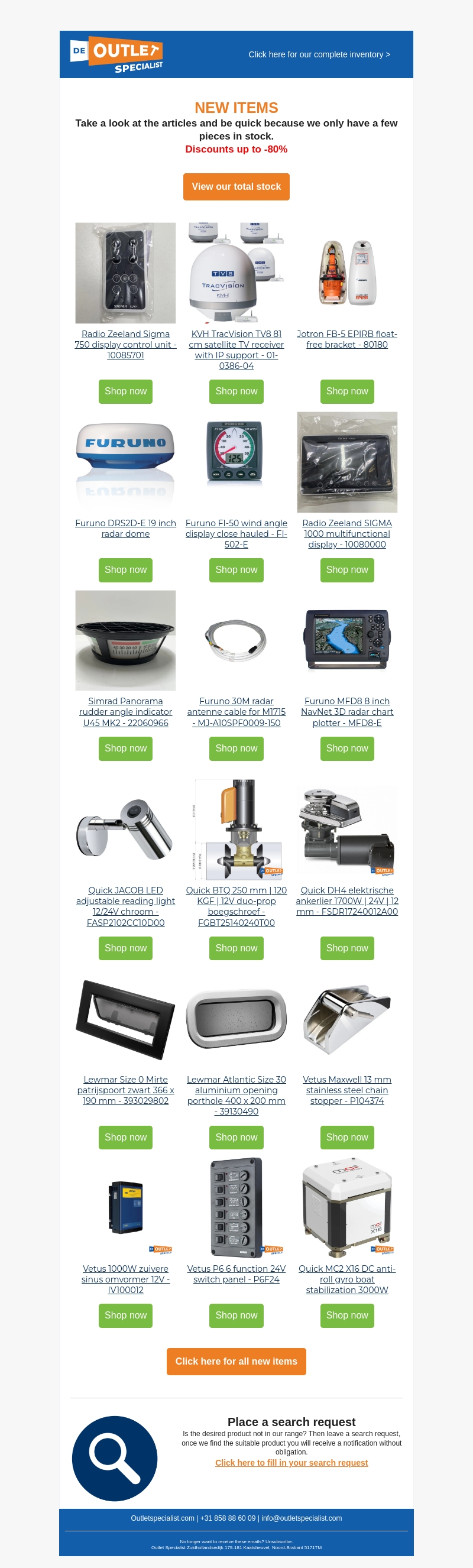 Bekijk onze nieuwste collectie van topmerken zoals KVH, Simrad, Lewmar, Vetus, en Furuno. Wees snel, want de voorraad is beperkt. Geniet van kortingen tot 80% op geselecteerde items. Bekijk ons volledige aanbod en mis deze geweldige deals niet.