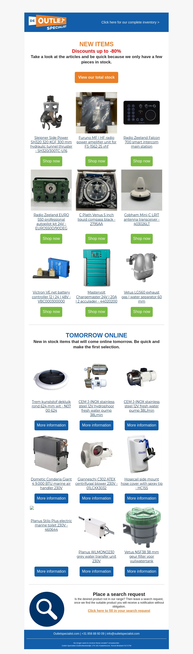Ontdek de nieuwste items met kortingen tot wel 80%! Bekijk nu ons aanbod van topproducten zoals de Sleipner Side Power, Furuno MF, Radio Zeeland, Mastervolt en Victron. Wees snel, want de voorraad is beperkt.