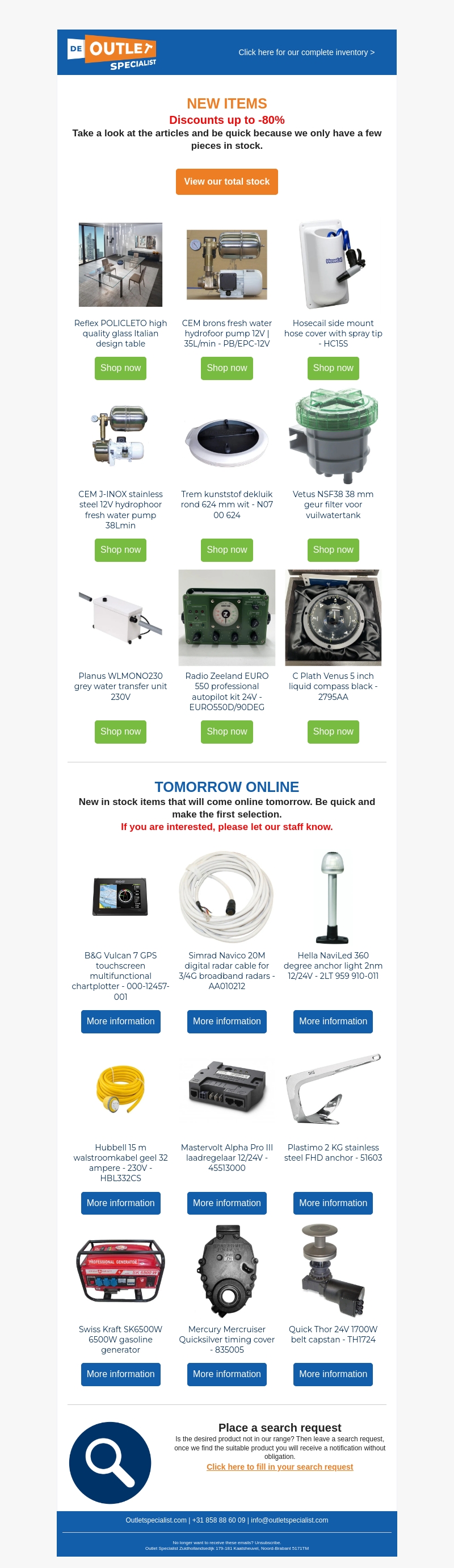 Bekijk onze nieuwste artikelen van merken zoals Simrad, Reflex, CEM en vele anderen. Profiteer van kortingen tot 80%. Wees er snel bij, want de voorraad is beperkt. Morgen komen er nog meer nieuwe items online. Informeer bij ons als u geïnteresseerd bent.