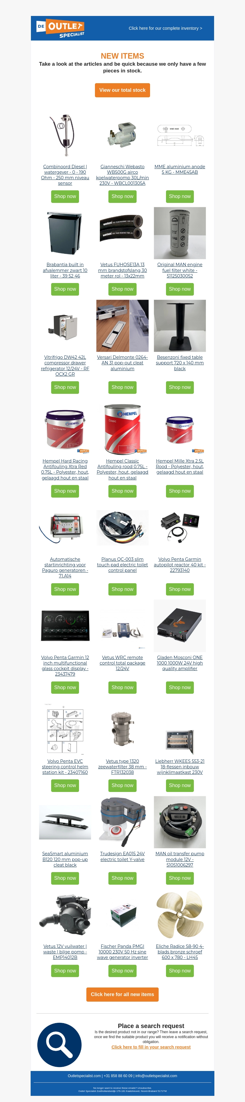 Ontdek de nieuwste producten van gerenommeerde merken zoals Webasto, Combinoord, Vetus, Vitrifrigo, Hempel en Liebherr. Van watergevers en koelsystemen tot verf en elektrische panelen, wij hebben alles wat je nodig hebt. Wees er snel bij, want de voorraad is beperkt. Bekijk ons volledige assortiment nu!