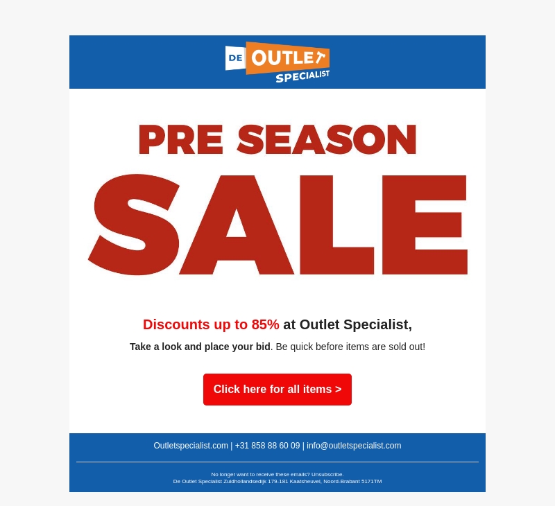 Mis de Pre Season Sale bij Outlet Specialist niet! Geniet van kortingen tot wel 85%. Neem een kijkje en plaats snel je bod voordat de artikelen zijn uitverkocht. Klik hier om alle items te bekijken en bespaar groots!