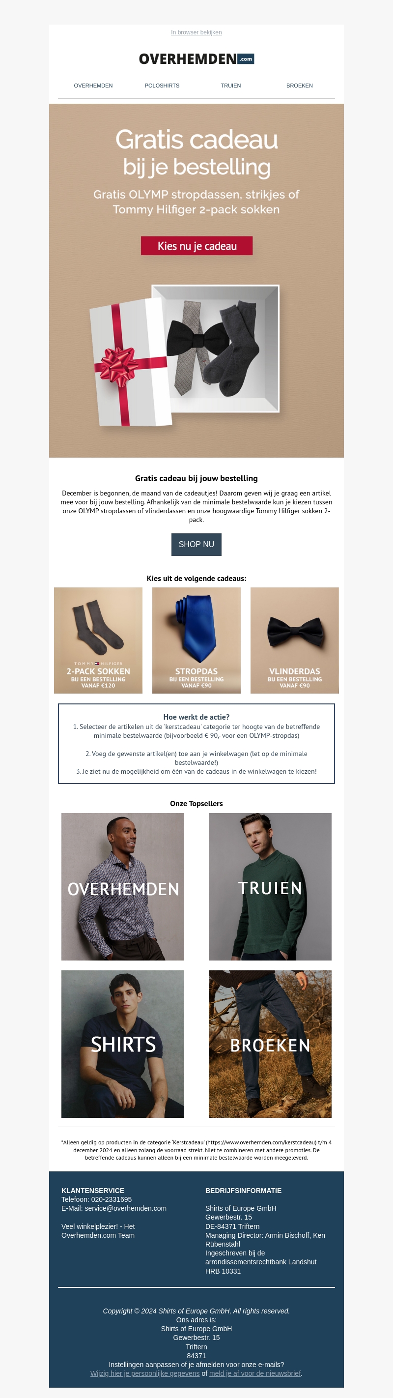 Begin december met een cadeau van ons! Bij je bestelling krijg je een gratis Olymp stropdas, vlinderdas of Tommy Hilfiger sokken. Kies je cadeau bij besteding vanaf €90. Bekijk de actievoorwaarden en winkel je favoriete overhemden, truien en meer.