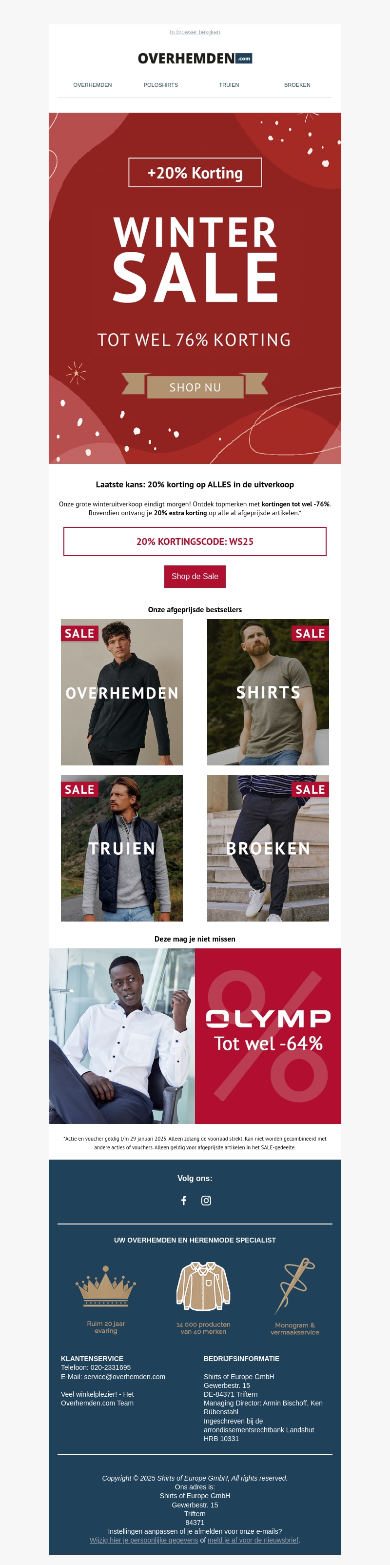 Ontdek de grootste winteruitverkoop met kortingen tot wel 76%. Profiteer van 20% extra korting op afgeprijsde artikelen bij Overhemden.com. Shop populaire items zoals overhemden, truien, shirts en broeken, en bespaar flink. Alleen geldig tot 29 januari 2023, dus wees er snel bij! Kijk voor de volledige voorwaarden op onze website.