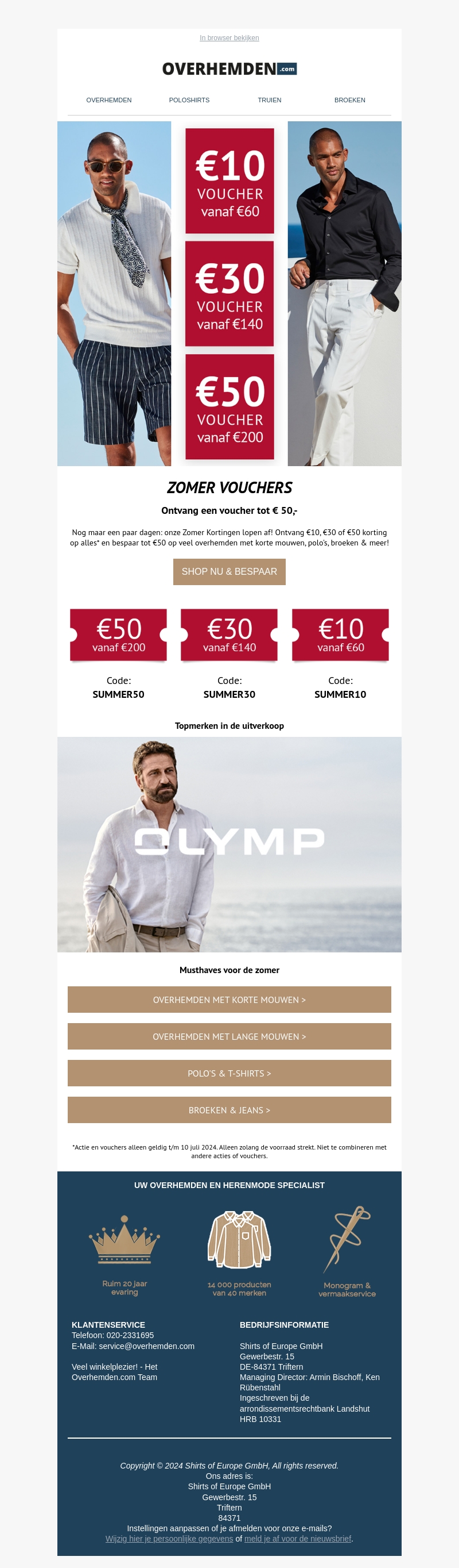 Ontvang zomerse kortingen met vouchers van €10, €30, of €50 op Overhemden.com. Geldig op een breed assortiment, van overhemden tot broeken. Snel, want deze actie loopt bijna af!