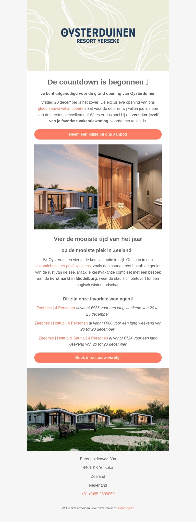 De klok tikt: nog maar 17 dagen tot de grand opening van Oysterdunen Resort Yerseke. Ontsnap deze kerst naar Zeeland en geniet in een luxe vakantiehuis met privé wellness. Bezoek ook de betoverende kerstmarkt in Middelburg. Boek nu jouw verblijf en wees er als één van de eersten bij!