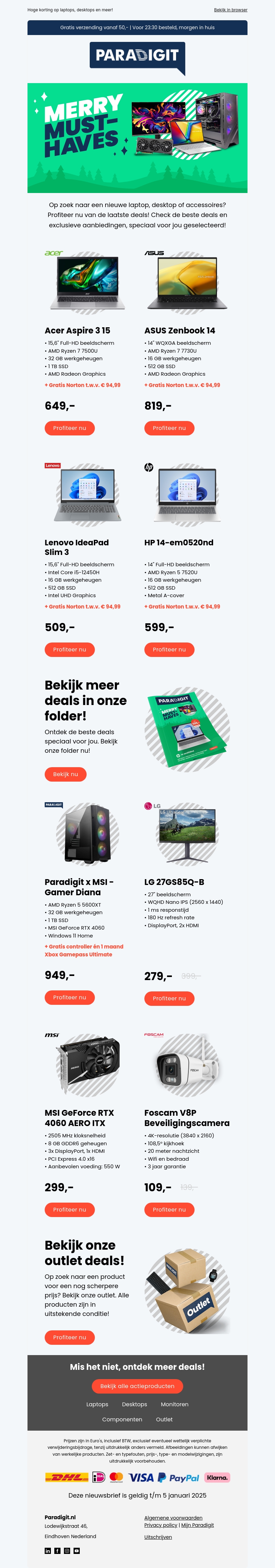 Paradigit presenteert zijn beste 'Merry Musthaves' met ongelooflijke kortingen op laptops, desktops en accessoires. Mis de Acer, Asus, Lenovo, en HP aanbiedingen niet. Profiteer ook van speciale acties op gaming-apparatuur en beveiligingscamera's. Bekijk de volledige folder voor meer deals en ontdek nog scherpere prijzen in onze outlet. Geldig tot 5 januari 2025.