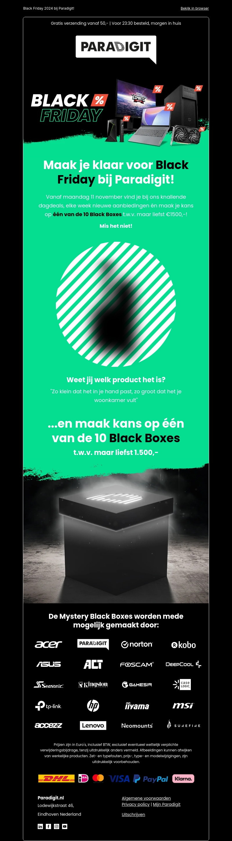 Bereid je voor op spectaculaire Black Friday 2024 aanbiedingen bij Paradigit. Geniet van spannende dagdeals en wekelijkse nieuwe aanbiedingen. Maak kans op een van de exclusieve Black Boxes ter waarde van maar liefst €1500. Mis deze unieke kans niet! Vraag jezelf af welk product deze mysterieuze doos vult.