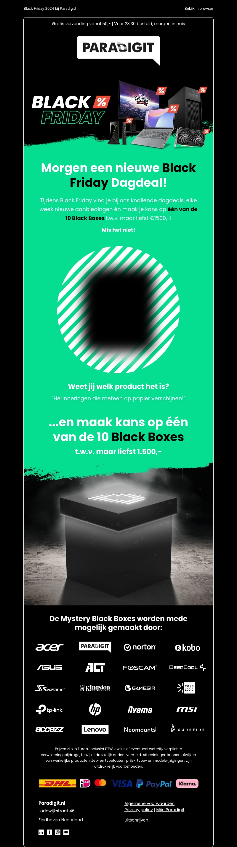 Black Friday staat voor de deur en Paradigit presenteert morgen een nieuwe exclusieve dagdeal. Elke week maak je kans op een van de 10 unieke Black Boxes ter waarde van €1500,-. Mis deze geweldige aanbiedingen niet en ontdek wat er in de Mystery Boxes zit. Dankzij onze partners kun je vertrouwen op kwaliteit en innovatie. Wees er snel bij en profiteer.