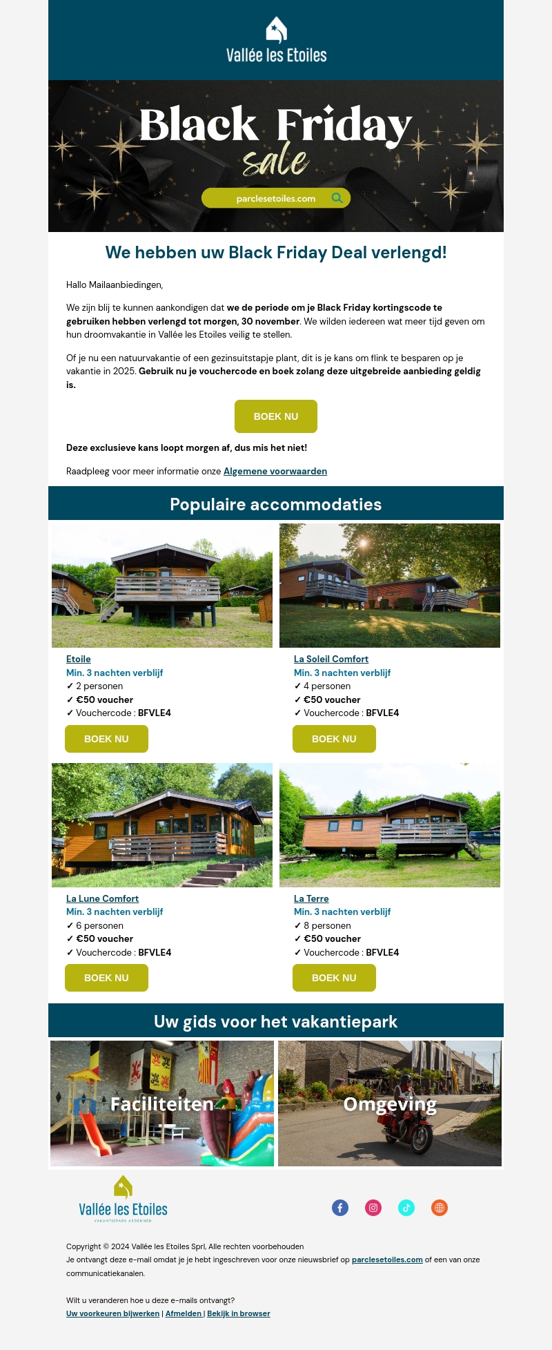 Vallée les Etoiles heeft geweldig nieuws voor u! De Black Friday deals zijn verlengd tot 30 november, waardoor u extra tijd heeft om te profiteren van fantastische kortingen op uw vakantie. Plan nu uw droomuitstapje, of het nu een natuurvakantie of gezinsreis betreft. Boek met de speciale kortingscode en geniet van exclusieve aanbiedingen bij Parc les Etoiles.