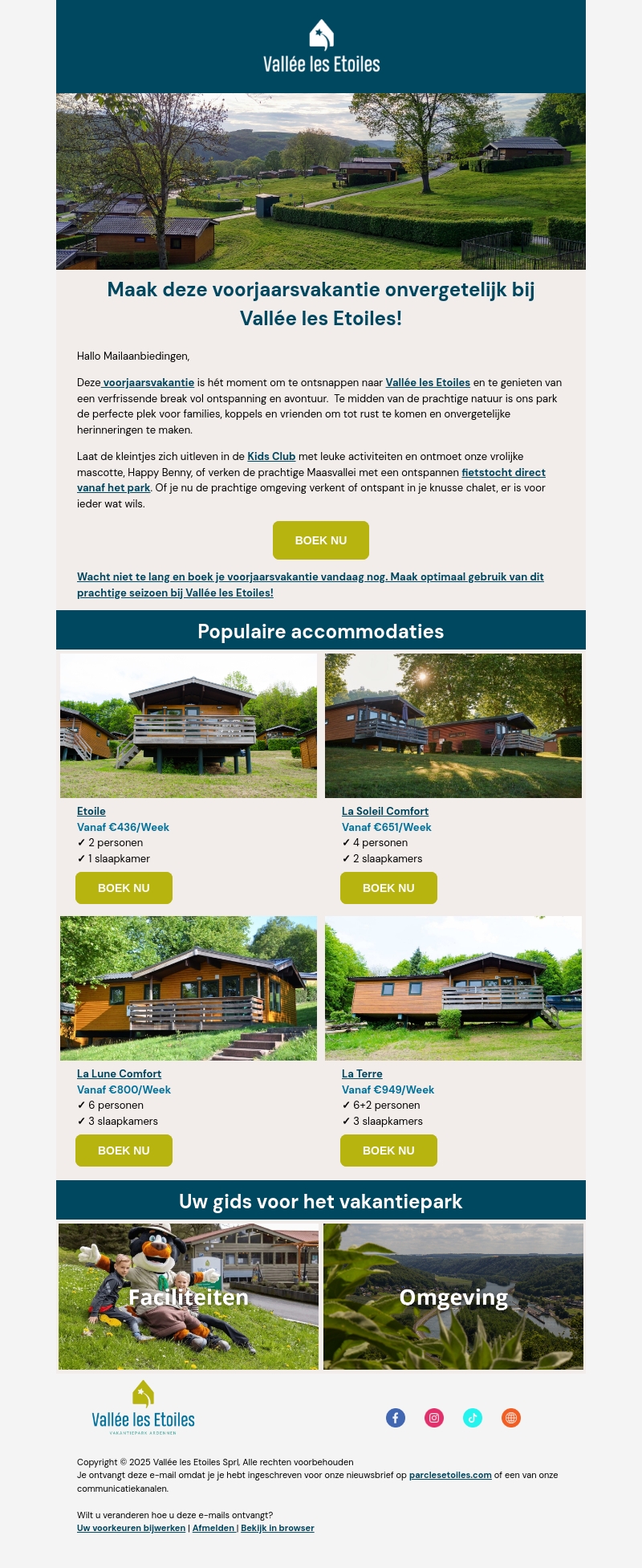 De voorjaarsvakantie is de perfecte tijd om te genieten van ontspanning en avontuur bij Vallée les Etoiles. Dit vakantiepark biedt prachtige accommodaties omringd door natuur, ideaal voor families, koppels en vrienden. Verken de omgeving met fietstochten of ontspan in de Kids Club met activiteiten voor de kinderen.