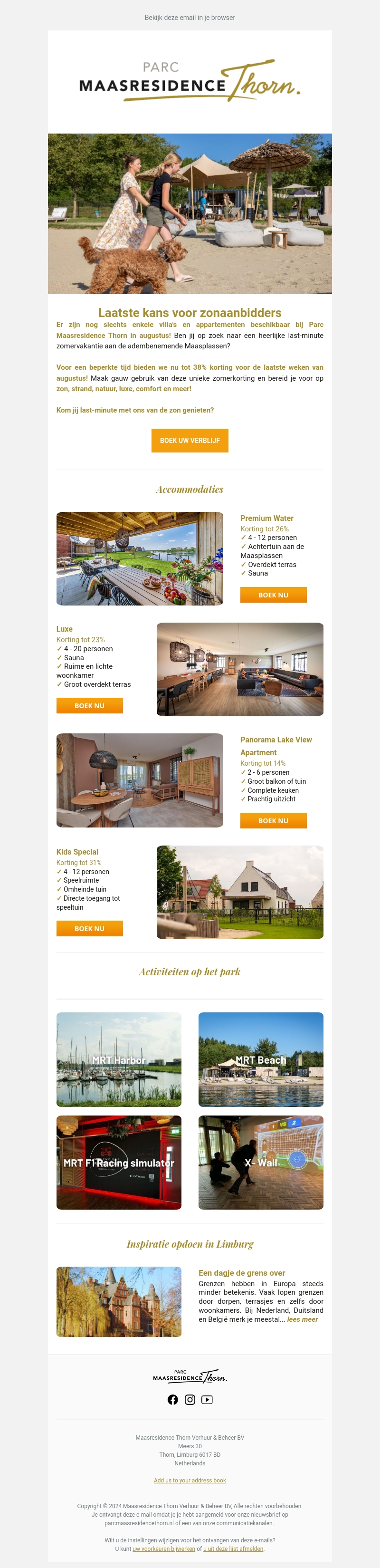 Laatste kans voor zonaanbidders. Boek nu je verblijf bij Parc Maasresidence Thorn met kortingen tot wel 38% in augustus. Geniet van accommodaties met luxe voorzieningen en tal van activiteiten op het park.