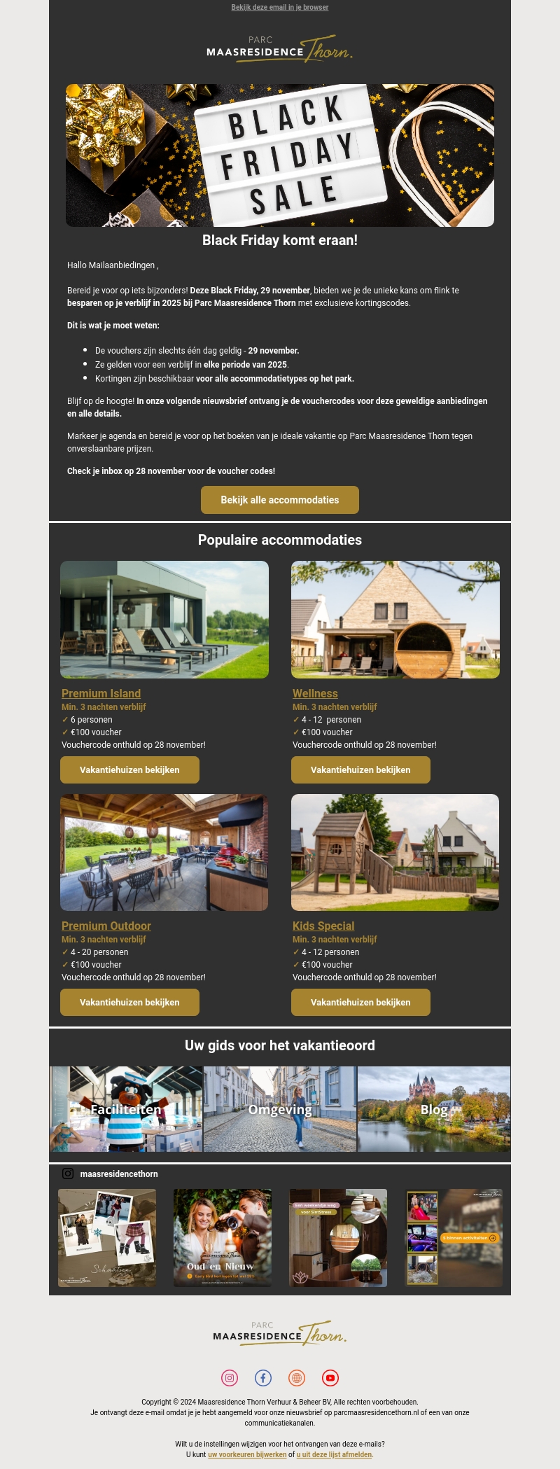 Bereid je voor op iets bijzonders met onze Black Friday aanbiedingen. Op 29 november bieden we speciale kortingcodes voor verblijven in 2025 bij Parc Maasresidence Thorn. Vouchers zijn één dag geldig en geldig voor alle accommodatietypes. Check je inbox op 28 november voor de codes.