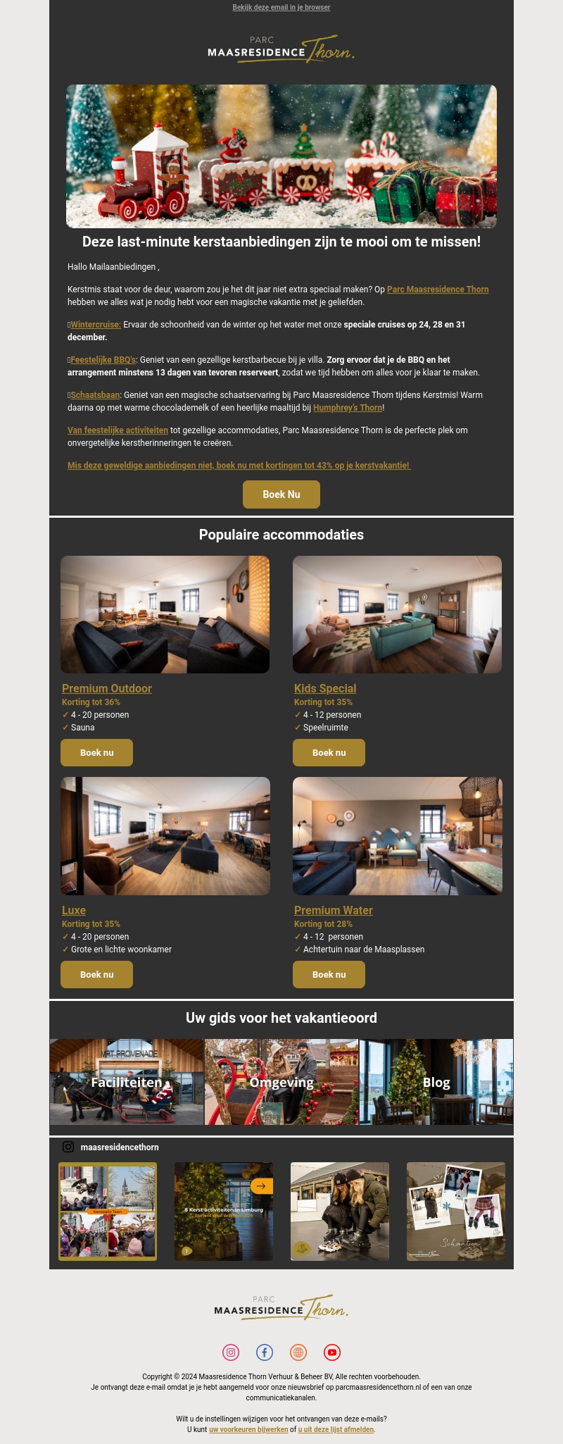 Kerstmis is nabij en Maasresidence Thorn biedt onvergetelijke vakantie-ervaringen. Geniet van wintercruises en gezellige BBQ's. Reserveer nu om te profiteren van kortingen tot 43%! Ideaal voor familie en vrienden.