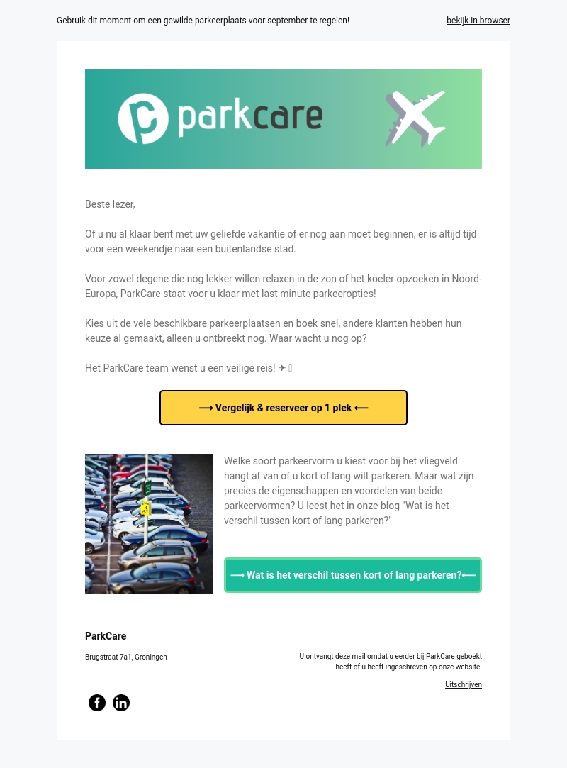 Beste lezer, bent u klaar voor een weekendje weg of vakantie? ParkCare heeft last-minute parkeeropties beschikbaar voor u. Kies uit vele beschikbare parkeerplaatsen en begin uw reis zonder zorgen. Het ParkCare team wenst u een veilige reis!