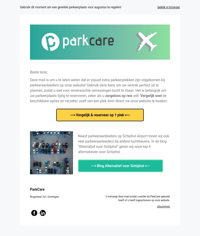 Beste lezer, er zijn extra parkeerplekken vrijgekomen bij onze parkeeraanbieders. Reserveer snel uw plek via onze website om zorgeloos op reis te gaan. Bekijk nu ook onze blog voor alternatieve parkings aan andere luchthavens.