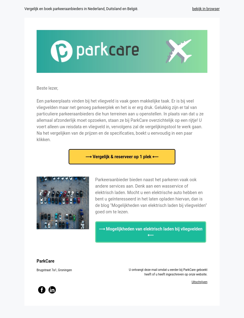 Het vinden van een parkeerplaats bij het vliegveld kan lastig zijn. Gelukkig biedt ParkCare een overzicht van de beste parkeeropties, inclusief extra services zoals elektrisch laden. Vergelijk de prijzen en specificaties en reserveer gemakkelijk online.