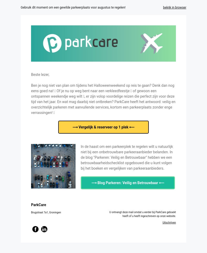 Ben je van plan om te reizen tijdens het Halloweenweekend? Zorg voor een zorgeloze trip met ons speciale parkeeraanbod. Of je nou naar een verkleedfeestje gaat of een ontspannen weekendje weg, bij ons vind je betaalbare en betrouwbare parkeeropties. Ontdek meer in onze blog en vergelijk gemakkelijk aanbieders.