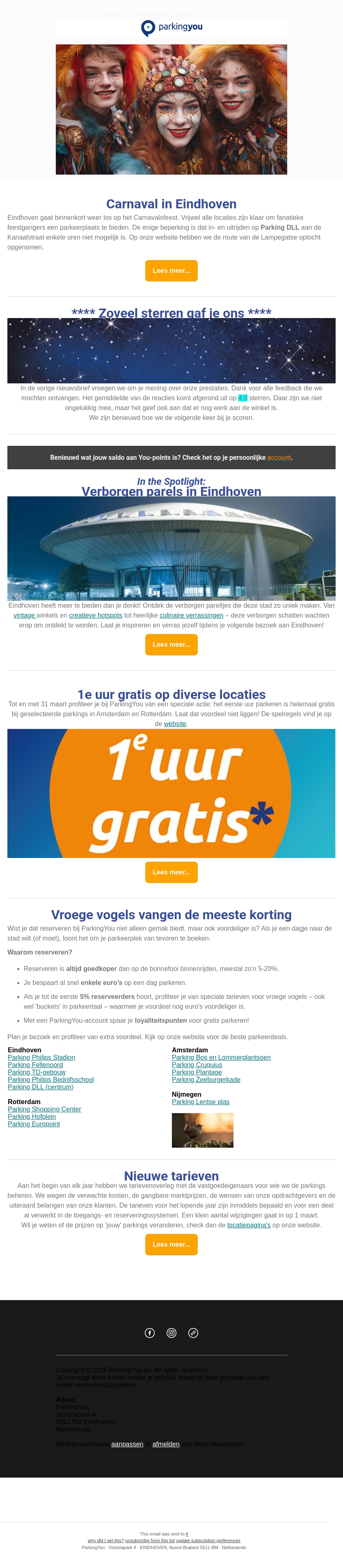 In de nieuwsbrief van februari 2025 biedt ParkingYou handige parkeeroplossingen tijdens Carnaval in Eindhoven. Ontdek verborgen pareltjes in de stad en profiteer van een uur gratis parkeren op diverse locaties. Voordelige reservaties zijn beschikbaar in steden zoals Rotterdam en Amsterdam. Plan je bezoek en geniet van de extra voordelen!