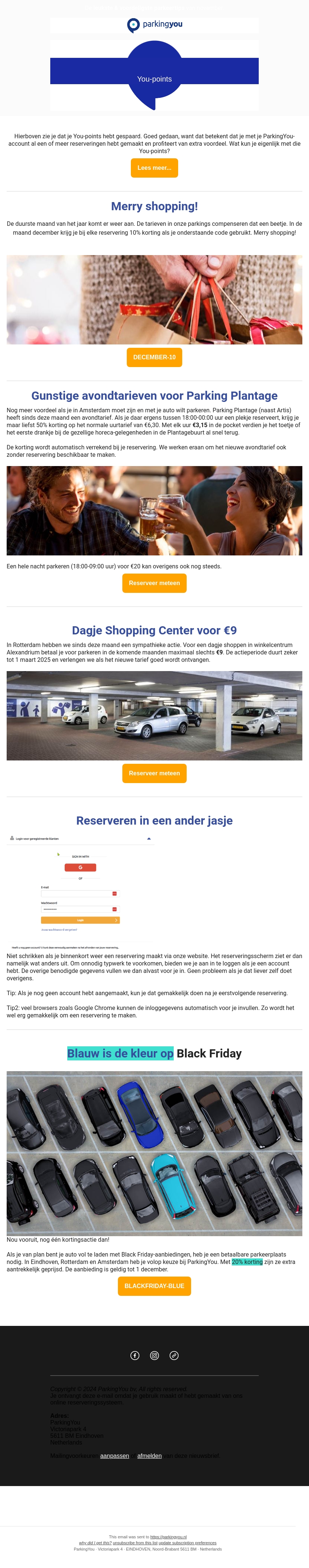 Deze nieuwsbrief van ParkingYou kondigt lagere tarieven aan voor december in Amsterdam en Rotterdam. Geniet van voordelige avondtarieven bij Parking Plantage en een speciaal tarief bij Dagje Shopping Center. Maak gebruik van een exclusieve 10% korting deze maand! Ontdek ook onze Black Friday-aanbiedingen met extra voordelen tot 1 december.